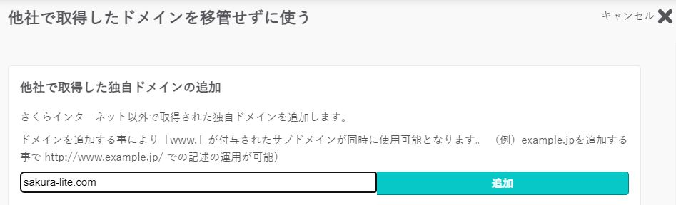 すると画面の右側に「他社で取得した独自ドメインの追加」のパネルがあらわれるので、当該ドメインをテキストボックスに入力して「追加」ボタンを押下する。