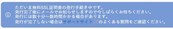 つづいてポリシーへの同意画面が表示されるので、チェックボックスにチェックをいれて「無料SSLを設定する」ボタンを押下する。証明書の発行手続き中であることを知らせる画面が表示される。