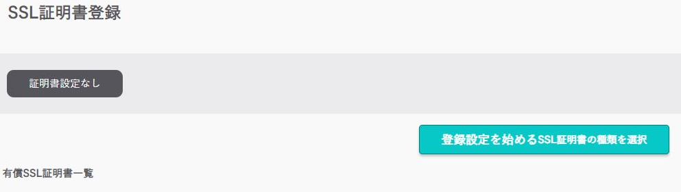 まず、管理画面の「ドメイン/SSL」にて当該ドメインの「SSL」ボタンをおす。証明書の登録画面が表示されるので、そこの「登録設定を始めるSSL証明書の種類を選択」ボタンを押下する。