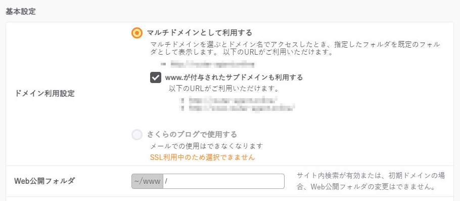 ドメイン設定のパネルが表示されるので、そのなかの「Web公開フォルダ」欄のテキストボックスに、手順6.で作成したディレクトリ名(今回の例では「sakura-lite」)を入力する。