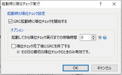 まず、メニューの「実行」>「起動時に順位チェック実行」をクリック。「起動時に順位チェック実行」ダイアログが表示されるので「GRC起動時に順位チェックを開始する」にチェックを入れる。チェックを入れたらOKボタンでダイアログを閉じる。